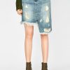 - Chân váy denim lệch gấu, xé rách, mài bạc mặt trước